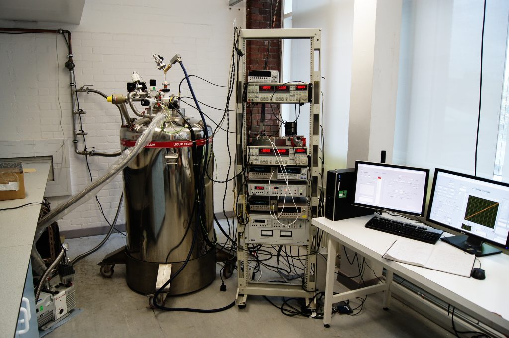 Рабочая установка аспиранта-измерителя. Большая бочка с гелием, в которую опускается образец и охлаждается до 4 К. К образцу подключают множество приборов, для измерения его свойств