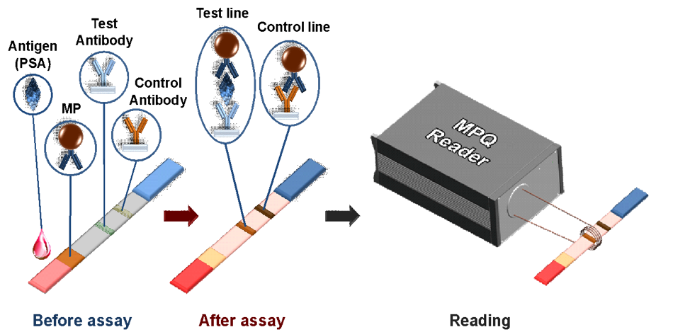 Антиген — анализируемый белок (например, ПСА). MP — магнитная наночастица, висящий снизу Y — антитело к анализируемому белку. Тестовые антитела (голубые Y) задерживают анализируемый белок, а контрольные (желтые Y) — антитела вместе с наночастицами.