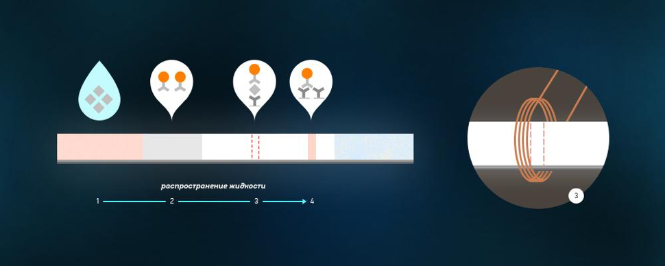 На полоску наносится капля исследуемой жидкости (1). Жидкость, распространяясь по полоске за счет капиллярного эффекта, захватывает магнитные частицы, которые “скреплены” с антителами к анализируемому белку (2). В процессе движения по полоске частицы связываются с нужным белком. Далее поток жидкости встречает две линии — тестовую (3) и контрольную (4). Тестовая содержит антитела, которые задерживают белок и заодно те магнитные метки, которые с ним соединились. Контрольная линия срабатывает в том случае, если тест-полоска пригодна к использованию. Изображение предоставлено пресс-центром МФТИ.