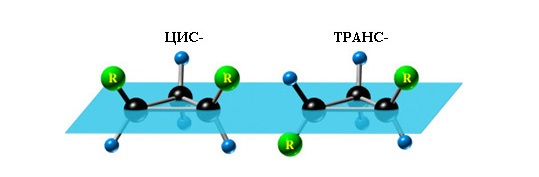 Наглядное объяснение цис-транс изомерии. В цис- конфигурации радикалы (зелёным) находятся по одну сторону от плоскости молекулы, в транс- — по разные. Изображение: orgchem.ru