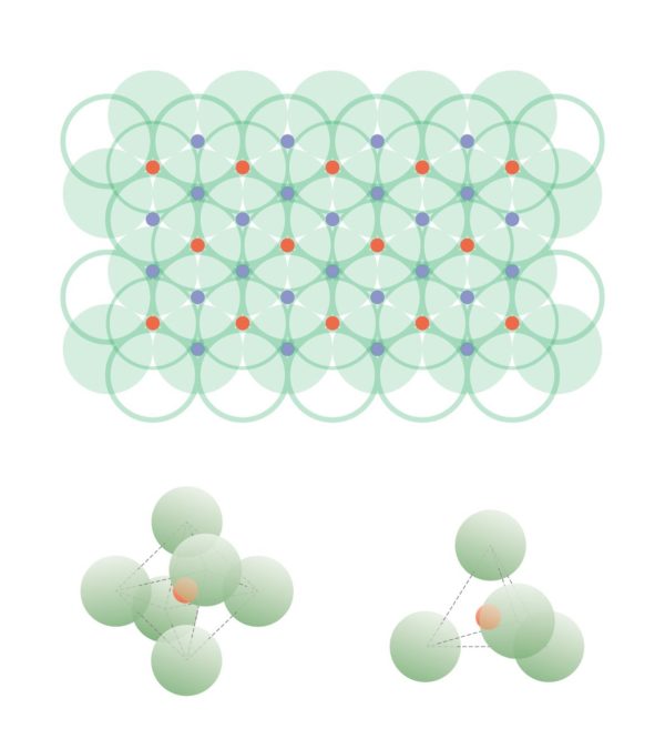 Тетраэдрическая (синий) и октаэдрическая (красный) пустоты в двухслойной плотнейшей упаковке и их положение в элементарной ячейке (внизу). Источник: пресс-служба МФТИ