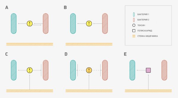 Механизм обратной связи между бактериями разных типов и кишечной стенкой: (А) Бактерия производит токсин, который для нее самой вреден, но питателен для бактерий другого типа; (B) Производя токсин, бактерии одного типа контролируют количество бактерий другого типа; (С) Стенка кишечника производит токсин, который вреден для одного типа бактерий и питателен для другого; (D) Стенка кишечника контролирует распространённость всех видов бактерий; (E) Стенка кишечника стенка производит питательные для бактерий вещества. Источник: пресс-служба МФТИ
