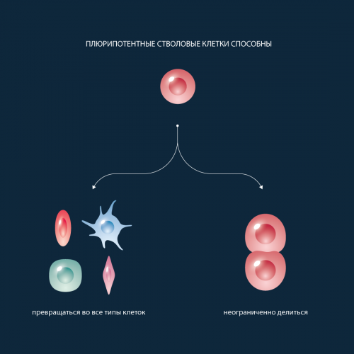 Стволовые клетки — это клетки, которые могут неограниченно делиться.Они имеют четкую специализацию, но также могут превращаться в клетки других типов. Именно стволовые клетки обеспечивают восстановление тканей и органов, именно из них берутся новые клетки взамен утраченных (рис.1). Медики и ученые выделяют несколько типов стволовых клеток в зависимости от их универсальности. Те клетки, которые могут превратиться в любую иную клетку, называются плюрипотентными. Во взрослом организме плюрипотентных стволовых клеток нет, это состояние характерно только для клеток первых дней эмбрионального развития.