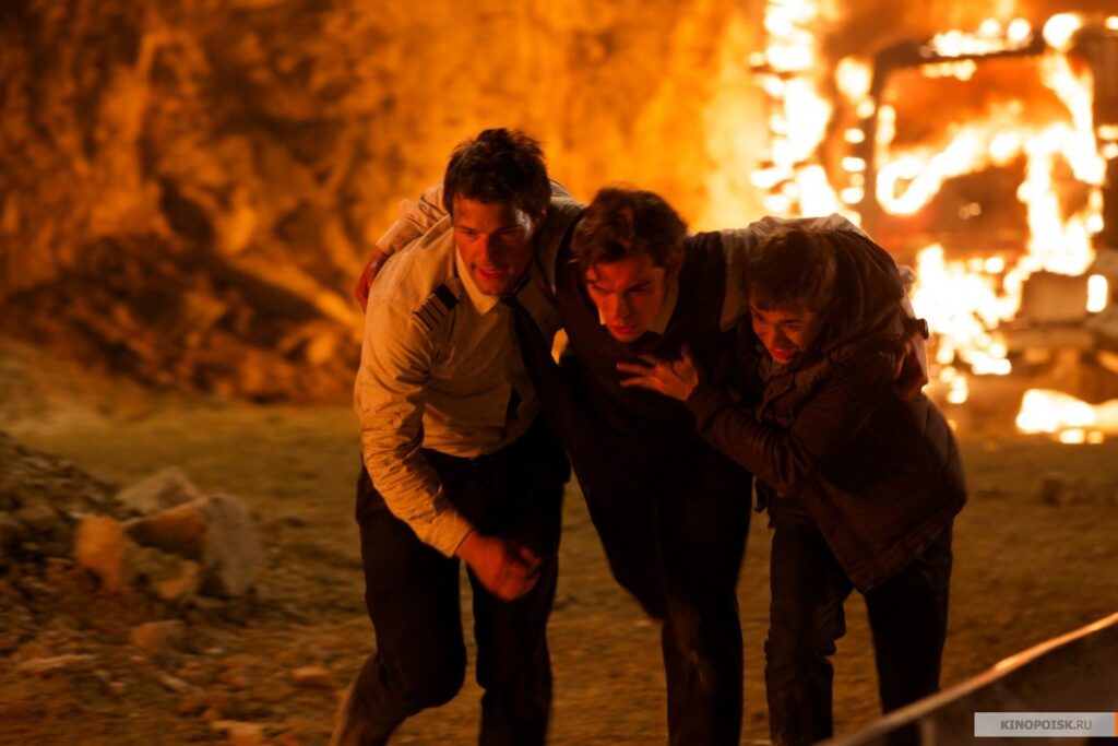 В кино: Самолет, пилотируемый Гущиным, пробивается через вулканический пепел. Один из двух двигателей загорается, и пилот выключает его после нескольких неудачных попыток устранить проблему. В салоне в этот момент бортпроводники оказывают первую помощь пострадавшим.