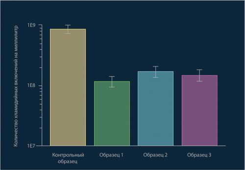 Чтобы проверить это, ученые добавили растворы, содержащие исследуемые белки в культуру человеческих клеток. Затем клетки заразили хламидиями вида Chlamydia trachomatis и через 48 часов оценили количество включений. Предположение о том, что белки способны подавить рост бактерий подтвердилось, в сравнении с контрольными образцами (без исследуемого белка) их число уменьшилось в десять раз. При этом видимый антихламидийный эффект достигался при концентрациях белков в 20 раз больше, чем при их действии на E. coli и B. subtilis. Это, как считают исследователи, может быть связано со сложным жизненным циклом хламидий.
