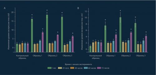 Уровни экспрессии двух генов системы (ctcB и ctcC) реакции на стресс в присутствии трёх разных видов исследуемых белков и в контрольном образце для пяти разных моментов времени. Иллюстрация: пресс-службы МФТИ