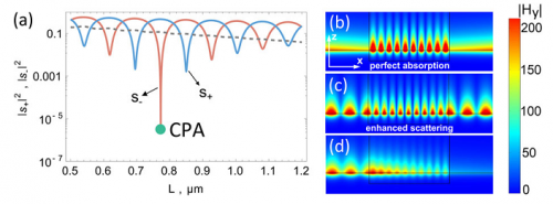 Когда такая наноструктура освещается поверхностными плазмонами с двух сторон, электрическое поле внутри нее имеет вид стоячей волны (рис. №2(b)), как колеблющаяся струна гитары. При определенных геометрических параметрах системы происходит полное поглощение излучения, рис. №2(a), (b) – 100% энергии плазмонов переходит в тепло внутри анизотропной структуры. Результаты, полученные учеными в ходе моделирования, говорят о возможности уменьшения доли рассеяния плазмонов до 0.1 процента в реалистичной наноструктуре. Согласно модели, количество непоглотившейся энергии можно свести к минимуму, изменяя геометрию наноструктуры, в том числе высоту поглощающего слоя.