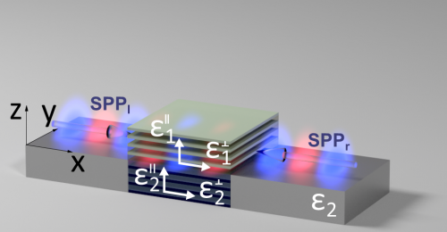 Чтобы преодолеть эту трудность, исследователи из МФТИ разработали дизайн особой поглощающей наноструктуры, представяющей собой две соприкасающиеся сильно анизотропные среды – т.е. такие среды, в которых коэффициент преломления зависит от направления распространения света. Эта структура, в свою очередь, интегрирована в традиционный металлический плазмонный волновод (Рис. 1). Именно сильная анизотропия поглощающей структуры позволяет полностью избавиться от нежелательного рассеяния плазмонов.