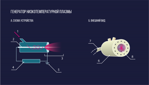 Генератор низкотемпературной плазмы: А: 1 — поток газа, 2 — микроволновый электрод, 3 — плазменная струя, 4 — источник питания, 5 — заземление; Б: 6 — металлический корпус, 7 — питание, 8 — струя плазмы