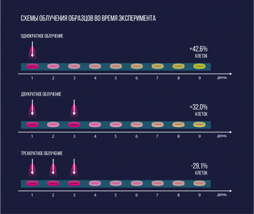 Ученые заметили, что облучение плазмой не прошло безрезультатно: в образцах фибробластов, обработанных однократно (А) и двукратно (В), количество клеток увеличилось на 42,6 % и 32,0 % соответственно по сравнению с контрольной группой клеток, не подвергавшихся облучению. Кроме того, не было никаких признаков разрывов ДНК сразу после обработки плазмой. При этом наблюдалось накопление клеток в активных фазах клеточного цикла и продление фазы роста до 30 часов. То есть воздействие плазмы несло регенерационный, а не разрушающий характер.