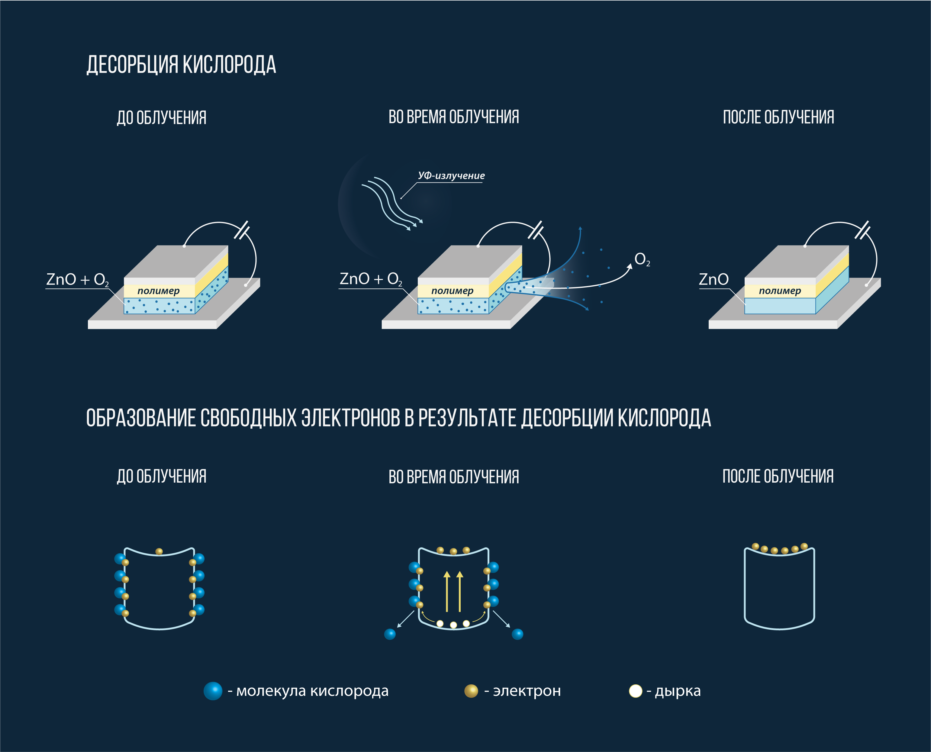 По словам ученых, чудодейственные свойства ультрафиолета объясняются тем, что излучение «отцепляет» атомы кислорода от молекул оксида цинка. При изготовлении фотодетектора молекулы кислорода сорбируются на полупроводниковые частицы ZnO, связываясь с электронами зоны проводимости. Электроны при этом уже не могут участвовать в переносе заряда. В таком состоянии слой оксида цинка является барьером для электронов.