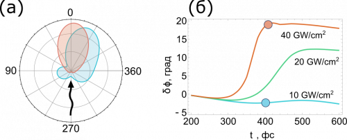 Для получения более полной картины ученые провели численное моделирование описанного механизма, Рис. 2б. При облучении слабым лазерным пучком рассеяние происходит вбок и направление излучения практически не меняется за время действия импульса (голубая кривая). Если же облучать наноантенны интенсивным лазером, который приводит к генерации электронной плазмы, происходит поворот диаграммы на 20 градусов (красная кривая). Таким образом, появляется возможность отклонять в различные направлений слабый и сильный падающие импульсы.