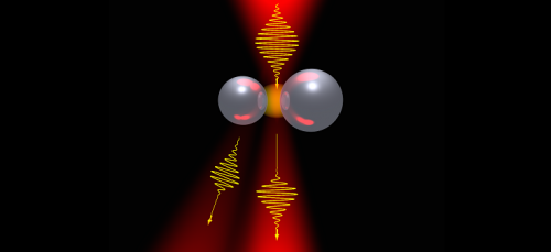 Схематическое изображение нелинейного рассеяния света на димере двух кремниевых частиц с изменяемой диаграммой направленности
