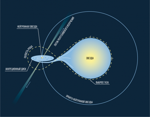Чтобы в системе из двух звезд наблюдался рентгеновский пульсар, материя должна перетекать с обычной звезды на нейтронную. Обычная звезда при этом может быть гигантом или сверхгигантом и обладать мощным звездным ветром, то есть выбрасывать в космос много вещества. Или это может быть небольшая звезда наподобие Солнца, которая заполнила свою полость Роша — область, за границей которой вещество уже не удерживается силой притяжения этой звезды и перетягивается гравитацией нейтронной звезды.