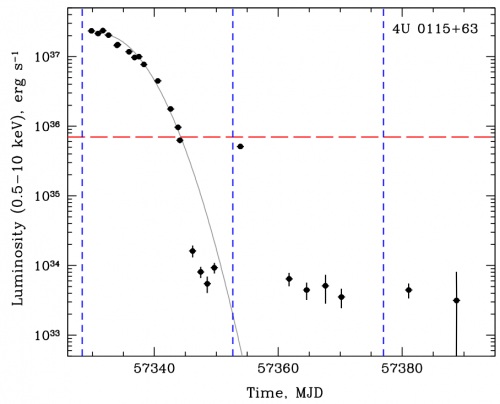В астрономии используется термин «светимость», то есть полная энергия, излучаемая небесным телом в единицу времени. Пороговая светимость для источника 4U 0115+63 показана красной линией. Для другого источника (V 0332+53) наблюдается аналогичная картина. Там, где проведены синие линии, расстояние между пульсаром и оптической звездой минимально. В таком положении режим аккреции может временно возобновляться при наличии достаточного количества вещества, что хорошо видно на рисунке