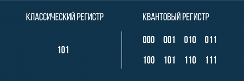 Регистр из трех классических битов кодирует три переменные, а из трех квантовых битов — восемь переменных.