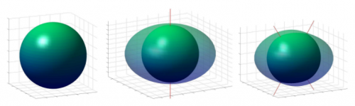 Изочастотные поверхности и оптические оси для изотропного кристалла (слева), одноосного кристалла (по центру), и двуосного кристалла (справа). В изотропных кристаллах все волны распространяются во всех направлениях с одинаковыми скоростями, поэтому изочастотная поверхность представляет собой сферу. Пример такого кристалла, обладающего кубической решеткой, — хлорид натрия (поваренная соль). В одноосных кристаллах существует направление в пространстве, в котором величина скорости волн одинакова независимо от поляризации, а изочастотная поверхность есть суперпозиция сферы и эллипсоида, касающихся в двух точках. Самый сложный случай при стандартном рассмотрении – двуосные кристаллы (например, глауберова соль). Изочастотная поверхность для них имеет четыре точки, в которых существует единственная скорость — эти точки лежат на двух оптических осях кристалла