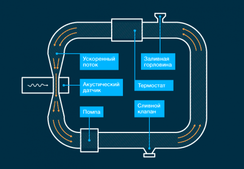 [columns size=»2/3″ last=»false»]С целью добиться гарантированно максимальной ориентированности, исследователи использовали установку, которая позволяет регулировать скорость потока и размер суженной области. Коллоид циркулирует по круглой резиновой трубке (рисунок №4), его толкает помпа, с помощью которой можно регулировать скорость потока. Термостат поддерживает постоянную температуру 25 градусов. По пути жидкость проходит через акустический датчик: с одной стороны трубки расположен излучатель ультразвуковых волн, с другой — приемник. Так как трубка резиновая, ширину зазора между излучателем и приемником можно изменять в широком диапазоне. Так формируется канал в форме приплюснутого круга, в котором ускоряется течение коллоида.[/columns]