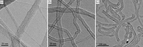 Фотографии ПЭМ коллоидов с тремя типами углеродных нанообъектов: (a) одностенные нанотрубки длиной 2200 нанометров и диаметром 6 нм; (b) нановолокна длиной 860 нм и диаметром 11 нм; (c) нановолокна длиной 430 нм и диаметром 19 нм
