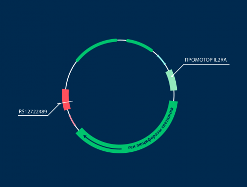 Ученые проверили, как замена буквы может влиять на транскрипцию, с помощью тестовой конструкции. В ней закодировали белок люциферазу, который в присутствии люциферина светлячка вызывает биолюминесценцию — химическую реакцию, сопровождающуюся испусканием света. Это стандартный генноинженерный прием, позволяющий по светимости определять активность транскрипции. В кольцевую ДНК вставили копию участка, с которого происходит запуск транскрипции IL2RA. Сразу за ней вставили ген люциферазы светлячка, а еще дальше — копию участка с rs12722489. Эти кольца поместили внутрь живых клеток, чтобы запустить внутриклеточные реакции и по степени светимости определить активность гена, которая зависит от регуляции транскрипции. Одна часть конструкций содержала А-вариант, другая — G-вариант, последний продемонстрировал светимость в 1,5 раза больше. Это означает, что замена rs12722489 ослабляет транскрипцию IL2RA.