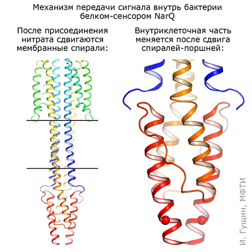 Выяснилось, что сигнальное и неактивное состояния отличаются в месте связывания нитрата совсем немного, на 0,5-1 ангстрема (примерно одна пятая размера самого иона; 1 ангстрем — 10-10 метра). Однако присоединение этого иона посередине между двумя киназами вызывает каскад изменений в белке: сначала, как поршни, сдвигаются трансмембранные спирали разных мономеров. Эти «поршни» передают небольшое изменение в 0,5-1 ангстрема через мембрану, и их внешние концы при этом раздвигаются на ~2.5 ангстрем в разные стороны. На выходе из мембраны, в НАМР-домене, продольные сдвиги спиралей конвертируются во вращение двух частей сенсора друг относительно друга. Эти сдвиги в итоге изменяют положение спиралей регулятора на целых 7 ангстрем, завершая передачу сигнала.