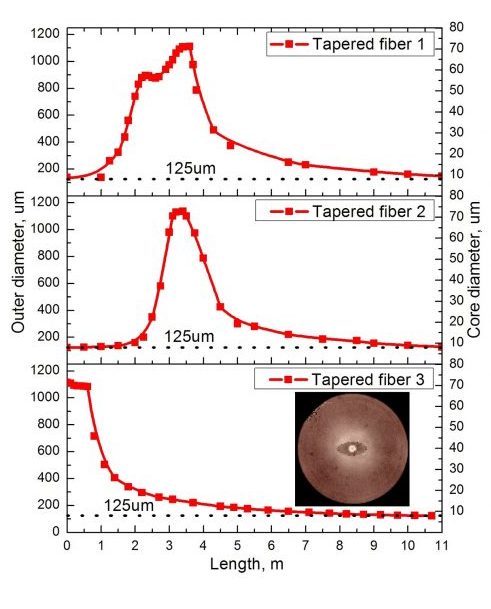 При увеличении оптической мощности света, распространяющегося по волокну, растет и количество поглощаемой энергии, что приводит к изменению характеристик волокна, а именно, например, происходит неконтролируемое изменение показателя преломления в материале, из которого волокно изготовлено. Эти эффекты приводят к тому, что возникают паразитные нелинейные эффекты, дополнительные спектральные линии излучения и т.д., что в значительной степени ограничивает мощность передаваемых сигналов. Решением этой проблемы, которое использовали и авторы данной статьи, является вариация диаметра сердцевины и оболочки вдоль длины волокна (рисунок №2).