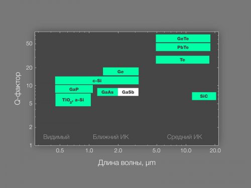 В своей работе, опубликованной в журнале Optica, ученые провели подробное систематическое исследование доступных высокоиндексных материалов в видимом и инфракрасном диапазонах с точки зрения резонансных характеристик. Набор таких материалов включает полупроводники и полярные кристаллы, такие как карбид кремния. В качестве наглядного параметра авторы выбрали Q-фактор (добротность) резонанса, который отражает, насколько быстро затухает возбужденный падающим светом резонанс. Теоретический анализ позволил заключить, что на сегодня лучшим материалом для реализации диэлектрических антенн в видимом диапазоне является кристаллический кремний, в ближнем инфракрасном — германий. В среднем инфракрасном диапазоне, который крайне интересен для решения таких задач, как радиационное охлаждение (т. е. охлаждение нагретого тела за счёт излучения электромагнитной энергии в окружающее пространство) и тепловой камуфляж (обратная задача — уменьшение свечения нагретого тела, которое можно видеть через тепловизор), лавры победителя достались сплаву германия и теллура (GeTe), Рис. №3.