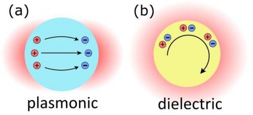 Оптические резонансы в (а) плазмонной и (b) диэлектрической частицах. Изображение предоставлено авторами статьи