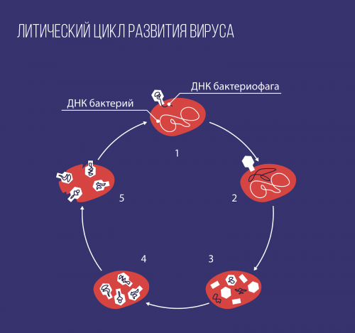 Литический цикл развития вируса: 1-2 — введение вирусной ДНК в бактериальную клетку, модификация жизнедеятельности бактерии; 3 — репликация фаговой ДНК и синтез вирусных белков; 4 — образование зрелых вирусных частиц; 5 — лизис (растворение) бактериальной клетки, выход новых фаговых частиц