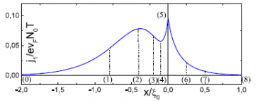 [columns size=»2/3″ last=»false»]Если нормальный металл обладает конечной диффузностью, то есть большой концентрацией примесей, то в нем возникают более сложные вещи — появление двух типов электронов, которые дают примерно одинаковый вклад в перенос тока. Один соответствует чистому нормальному металлу с пиком внутри сверхпроводника, а второй — электронам диффузионного типа, движущимся параллельно границе. В результате распределение тока оказывается более сложным, с двумя пиками.[/columns]