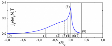 [columns size=»2/3″ last=»false»]Если граница диффузная, то спонтанный ток возникает гораздо ближе к границе, где-то в масштабе 04. Физическая причина — в случае идеальной границы сверхпроводящий ток переносится электронами, которые движутся под углом к границе около 45 градусов, а в случае диффузной границы основной вклад в сверхпроводящий ток дают электроны, которые движутся почти параллельно границе, и из-за этого серьезным образом изменяется профиль тока.[/columns]