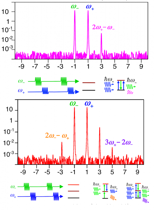 График, отображающий результат эксперимента: по горизонтальной оси частота излучения, по вертикали — интенсивность. Два самых высоких пика соответствуют исходному излучению, а помеченные розовым, оранжевым и фиолетовым возникают в результате квантового эффекта смешивания волн на отдельном атоме. Верхний и нижний графики отличаются тем, сколько уровней энергии было у искусственного атома: два (сверху) или три (снизу)