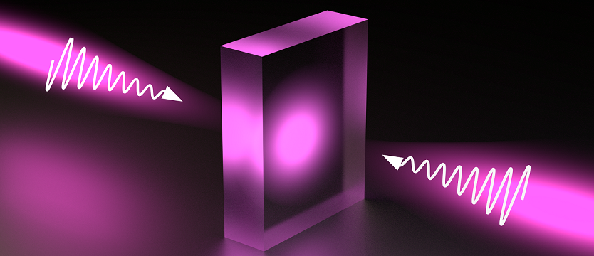 Схематичное изображение процесса виртуального поглощения: слой прозрачного материала освещается с двух сторон пучками света с нарастающей во времени интенсивностью. Изображение предоставлено авторами статьи