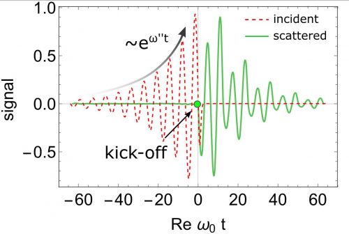 Чтобы продемонстрировать описанный эффект, авторы рассмотрели тонкий слой прозрачного диэлектрика и рассчитали необходимый для виртуального поглощения профиль интенсивности падающего света. Численные расчеты подтвердили, что при экспоненциальном нарастании интенсивности падающей волны (показана пунктиром на рис. №2) прохождение и отражение от такого слоя полностью отсутствуют (сплошная кривая на рис. №2): иными словами, слой выглядит идеально поглощающим, несмотря на отсутствие фактического поглощения. Однако, когда экспоненциальное нарастание амплитуды падающей волны прекращается (момент времени t = 0), вся «запертая» внутри слоя энергия начинает покидать его.