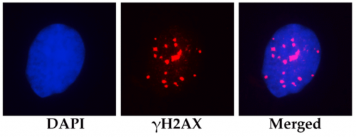 Микрофотография ядра мезенхимальной стволовой клетки человека. Слева направо: ДНК клеточного ядра, окрашенная DAPI (синий); скопления (фокусы) белка γH2AX (красные точки), маркирующего повреждения ДНК; наложенные микроизображения (merged)