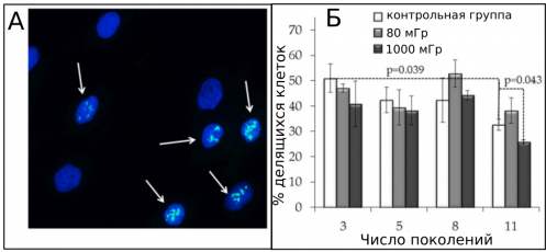 А) Стрелками обозначены делящиеся клетки, меченные флуоресцентными красителями и имеющие повреждения — двойные разрывы ДНК; Б) зависимость количества делящихся клеток контрольной группы и клеток, облученных дозами в 80 мГр и 1 000 мГр в течение 11 поколений