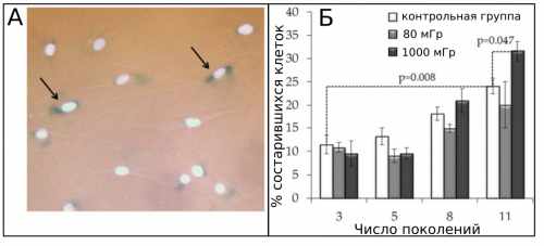 А) Стрелками отмечены стареющие клетки, меченные красителями (синим — цитоплазма, белым — клеточные ядра); Б) количество состарившихся клеток контрольной группы и клеток, облученных дозами в 80 мГр и 1 000 мГр в течение 11 поколений