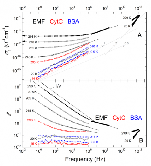 Зависимость от частоты проводимости (сверху) и диэлектрической проницаемости (точнее, ее мнимой части, то есть энергетических потерь; снизу) для различных значений температуры. Альбумин отмечен синим цветом, цитохром — красным, EMF — черным. Из графика видно, что проводимость EMF при комнатной температуре и низких частотах практически не меняется, а при повышении частоты или понижении температуры растет линейно с частотой. Проводимость альбумина и цитохрома растет линейно во всем диапазоне частот и температур, а потери энергии остаются постоянными. Credits: K. A. Motovilov et. al. / Scientific Reports 7, 15731 (2017)