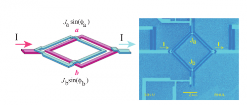 В этом выражении Ia и Ib — критические токи отдельных джозефсоновских переходов, φa — определяемое геометрией нового интерферометра одинаковое изменение фазы волновой функции на каждом переходе, а π(nu +nd) — фазовое слагаемое, в котором nu и nd целые числа квантования момента импульса в верхнем и нижнем сверхпроводящих контурах.