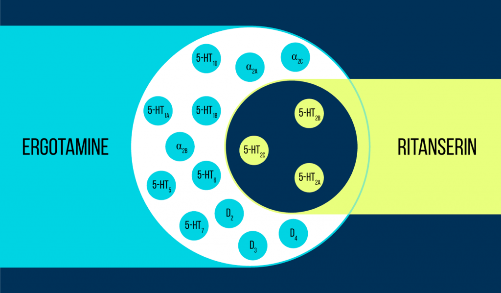 Сравнение селективности исследованных препаратов эрготамина и ритансерина. Важнейшее отличие между ними — профиль селективности, то есть набор белков организма, с которыми они могут взаимодействовать. Ритансерин — крайне селективный препарат, действующий лишь на определённые подтипы серотонинового рецептора (тёмно синий-круг с жёлтыми кружками). Эрготамин же воздействует не только на все мишени ритансерина (голубой круг, в который входит и тёмно-синий), но и более чем на 800 других белков организма, вызывая множество разноплановых эффектов. Дизайнер: Елена Хавина, пресс-служба МФТИ