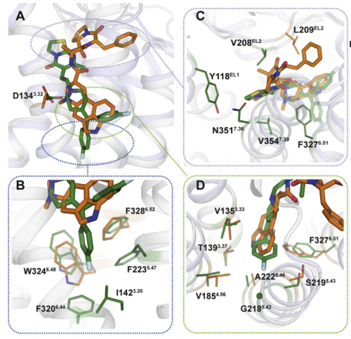 Лекарственные препараты по-разному прикрепляются к белкам. Рентгенограммы комплексов белка с лекарственными препаратами, полученные исследователями, позволили изучить различия в способе закрепления молекулы лекарства на поверхности белка. Как можно видеть, эрготамин (оранжевая молекула) располагается на поверхности белка совершенно иначе, нежели ритансерин (зеленая молекула). К тому же они взаимодействуют с разными аминокислотами в молекуле мишени, чем и объясняется большая селективность ритансерина в сравнении с эрготамином. Источник: Яо Пенг и др., Cell