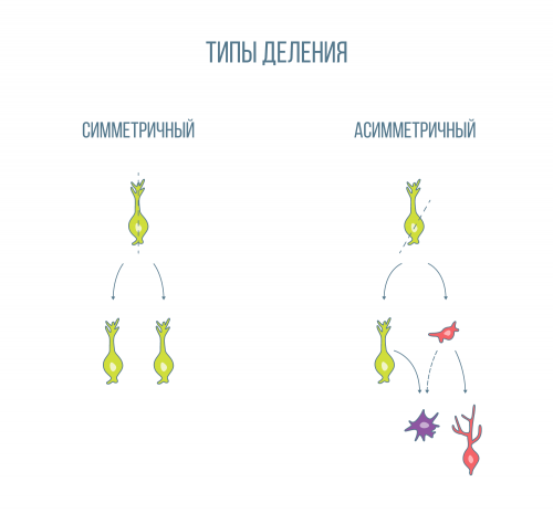 Типы деления клеток. При симметричном делении (слева) из одной стволовой клетки (зелёные) образуются две такие же стволовые, а при асимметричном (справа) — образуются одна стволовая клетка и предшественник нейрона (красная клетка) или астроцит (фиолетовая клетка)