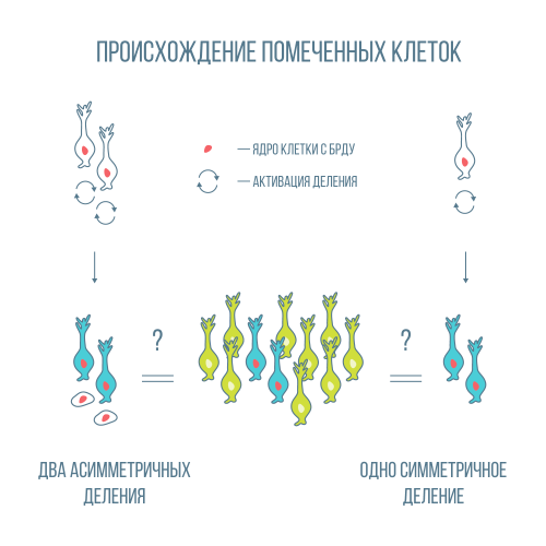 На срезе мозга находятся помеченные БрдУ стволовые клетки (фрагмент посередине) среди множества неделящихся или покоящихся стволовых клеток (светло-зелёные). Такие меченые пары могут встречаться или из-за активации асимметричного типа деления двух неродственных стволовых клеток, находящихся рядом (вариант слева), или из-за симметричного деления одной стволовой клетки (справа). По рисунку, предоставленному Ольгой Минеевой, автором статьи