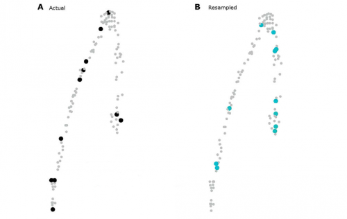 Для того, чтобы измерить реальное и смоделированное случайное число пар клеток, на микроскопических изображениях срезов находили местоположение всех стволовых клеток, содержащих и не содержащих маркер делений БрдУ. Таким образом, для каждой клетки было определено её положение в пространстве. Затем по полученным координатам определяли расстояния между парами реально наблюдаемых меченых клеток и число пар клеток на конкретных расстояниях (рис. №3А). Затем искусственно моделировали случайное распределение меченых клеток для сравнения. Для этого использовали все положения, в которых могли появиться меченые клетки, т. е. координаты всех делящихся и неделящихся стволовых клеток. Из списка координат с помощью генератора случайных чисел выбирали такое же количество клеток, что наблюдалось на срезе в действительности, и условно принимали их за меченые. Получался тот же срез, но теперь уже с псевдомечеными клетками, разбросанными на нем случайным образом (рис. №3Б). Допустим, если мы увидели 11 меченых клеток на срезе (как на рис. №3А), то среди всех возможных позиций будет разбросано 11 псевдомеченых клеток (рис. 3Б) и рассчитано распределение расстояний между ними. Эта операция была повторена много раз для получения статистики со всех срезов. Сравнив реальное распределение с моделируемым случайным, авторы увидели, что они не отличаются друг от друга. Однако отсутствие различий между реальной и случайно сгенерированной картиной могло быть связано с низкой чувствительностью метода. Чтобы проверить это, исследователи попробовали добавить в модель заданное количество пар сближенных делящихся клеток и оценить, сколько симметричных делений нужно, чтобы новое искусственно сгенерированное распределение начало отличаться от случайного. Получилось, что нужно добавить больше 10% событий симметричных делений. Из этого ученые сделали вывод о том, что в реальном взрослом гиппокампе симметричных делений нервных стволовых клеток не происходит, или же они происходят, но крайне редко, и их доля составляет не больше 10%.