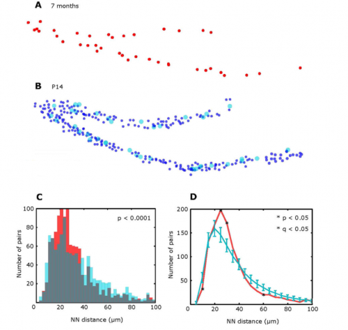 A) Оставшиеся стволовые клетки у 7-месячной мыши. В) Стволовые клетки 2-недельной мыши, среди которых случайным образом выбрано (голубым) такое же количество клеток, которое осталось у 7-месячной. C, D). Реальное распределение расстояний между ближайшими клетками (красным) отличается от случайного (голубым)