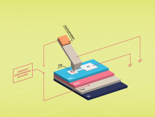 Экспериментальная установка, схема. Сверху — острая игла, при помощи которой физики определяли поляризацию сегнетоэлектрического материала; далее идет «бутерброд» из проводника, изолятора, оксида гафния и снова проводника на кремниевой подложке: эти слои образуют плоский электрический конденсатор. Красные линии схематически показывают электрические проводники, подключённые к образцу. Дизайнер: Елена Хавина, пресс-служба МФТИ