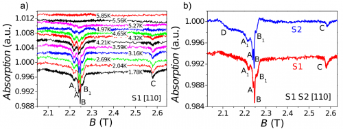 a) Зависимость поглощенного излучения от магнитной индукции и температуры образца: при температуре менее пяти кельвинов наблюдается резкое увеличение поглощённой энергии за счет магнитного резонанса. (b) Сравнение доли поглощённого излучения для образцов с разными поверхностями. Изображение: Сергей Демишев и др., Scientific Reports