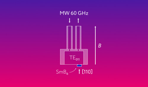 Схема резонатора для измерения магнитного резонанса на частоте 60 ГГц. Синим прямоугольником показан монокристалл гексаборида самария, стрелка соответствует кристаллографическому направлению [110] образца. Стрелками вверху показаны направления потока микроволнового излучения в подводящих волноводах. TE011 обозначает моду электромагнитного поля в резонаторе, на которой велись измерения. Длинная стрелка показывает направление магнитного поля. Дизайнер: Lion_on_helium, пресс-служба МФТИ, по рисунку авторов статьи