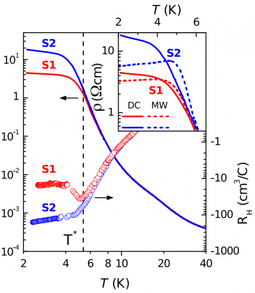 Удельное сопротивление (линии) и коэффициент Холла (точки) монокристаллов SmB6 с зеркально обработанной (S1) и травленой (S2) поверхностями. На вставке удельное сопротивление на постоянном токе (DC) сопоставляется с обратной микроволновой проводимостью (MW). Изображение: Сергей Демишев и др., Scientific Reports