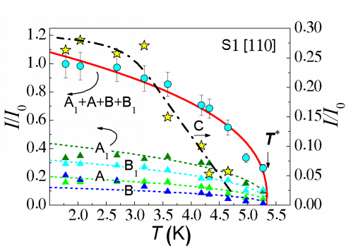 Температурная зависимость интегральной интенсивности магнитного резонанса в SmB6. Сплошной красной линией показана зависимость I(T)~(T *-T )ν с показателем степени ν=0,37 и критической температурой T *=5,34 K. Изображение: Сергей Демишев и др., Scientific Reports